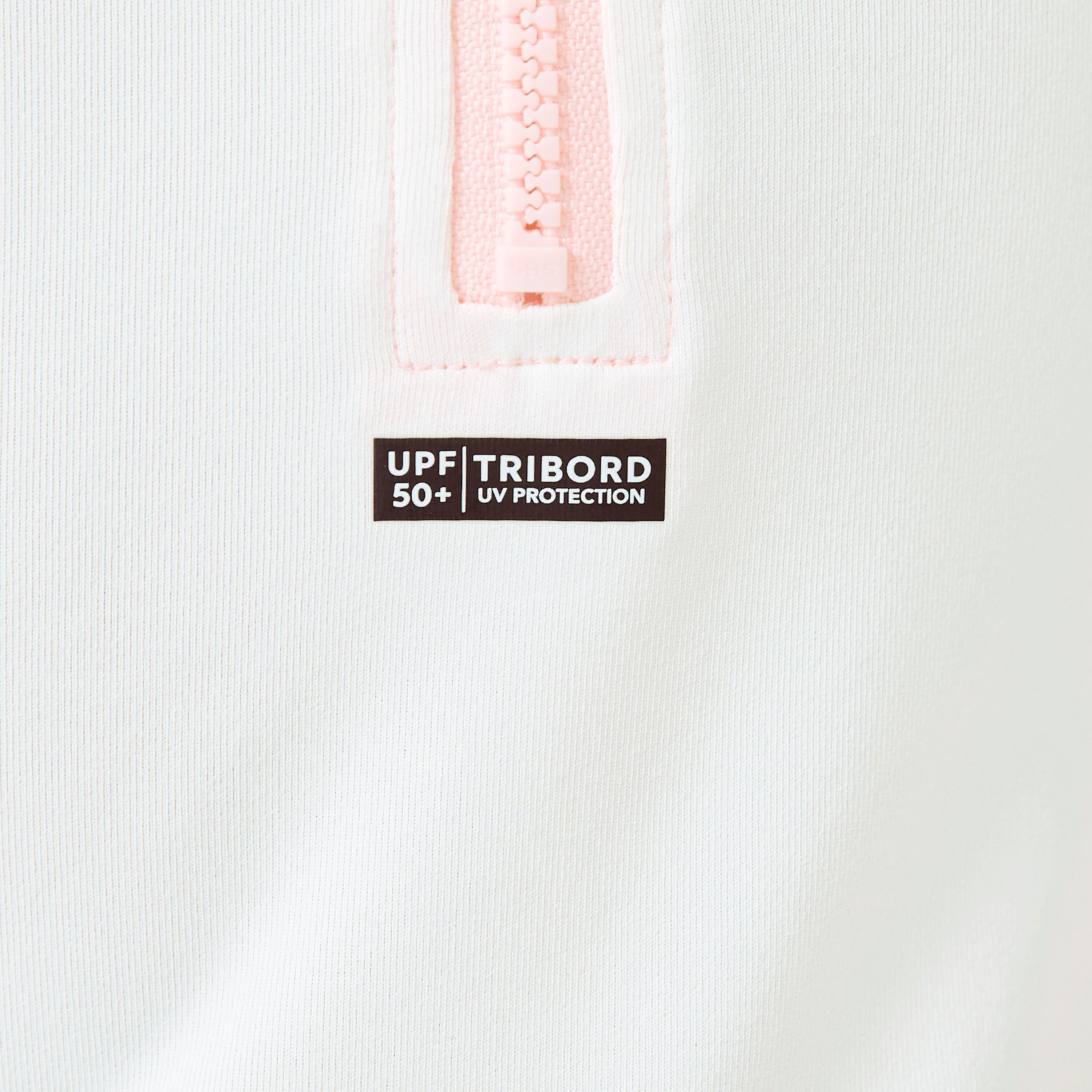 مايوه سباحة للرضع بأكمام طويلة مصنوع من نسيج معاد تدويره ويوفر الحماية من الأشعة فوق البنفسجية حتى داخل الماء، ويسهل ارتداؤه بفضل الكباسين المزودة عند الياقة من الخلف ومنطقة ما بين الفخذين.