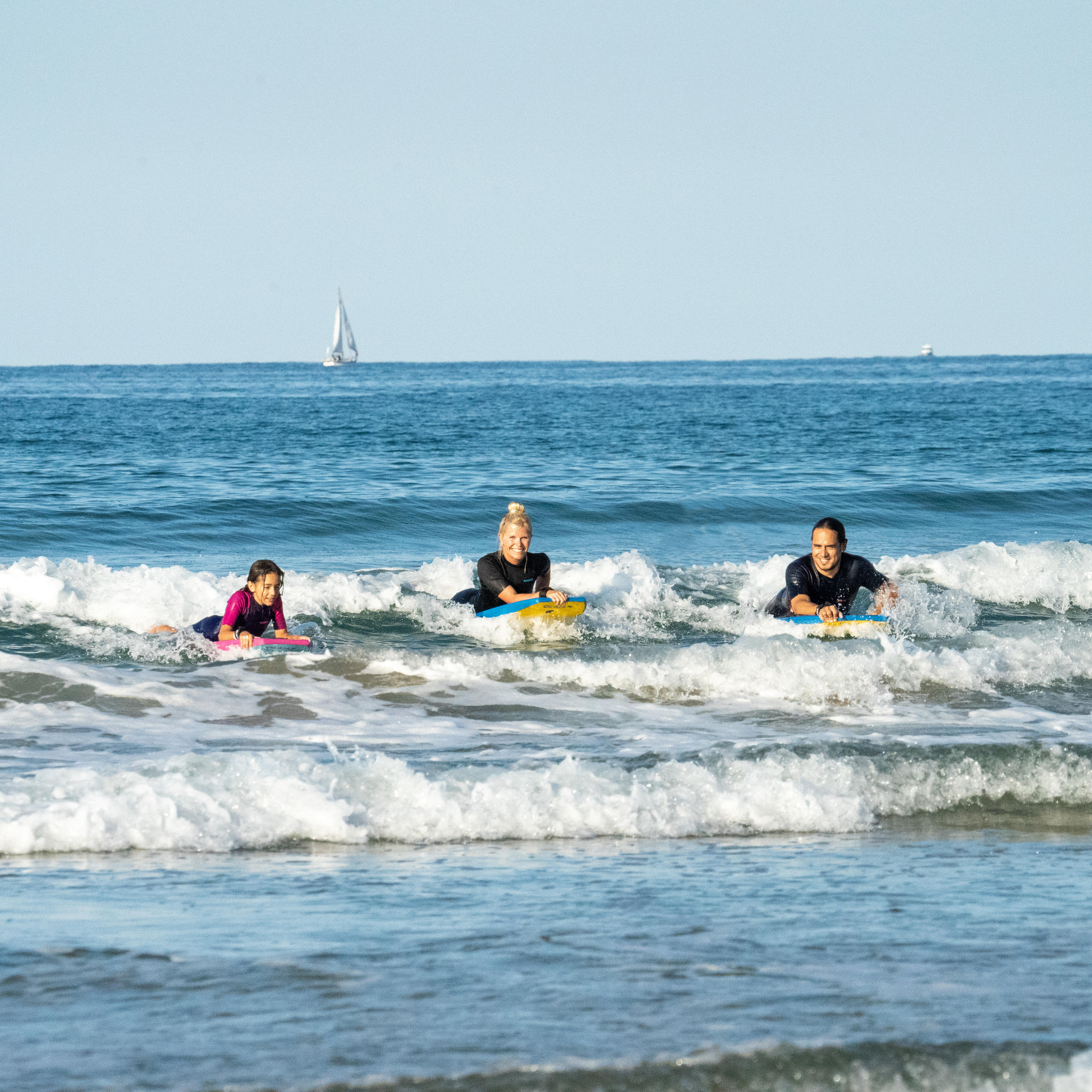 3- استخدم المعدات المناسبة: رباط أمان، وزعانف، ولوح بحالة جيدة، وبدلة سباحة مناسبة.