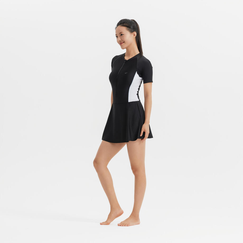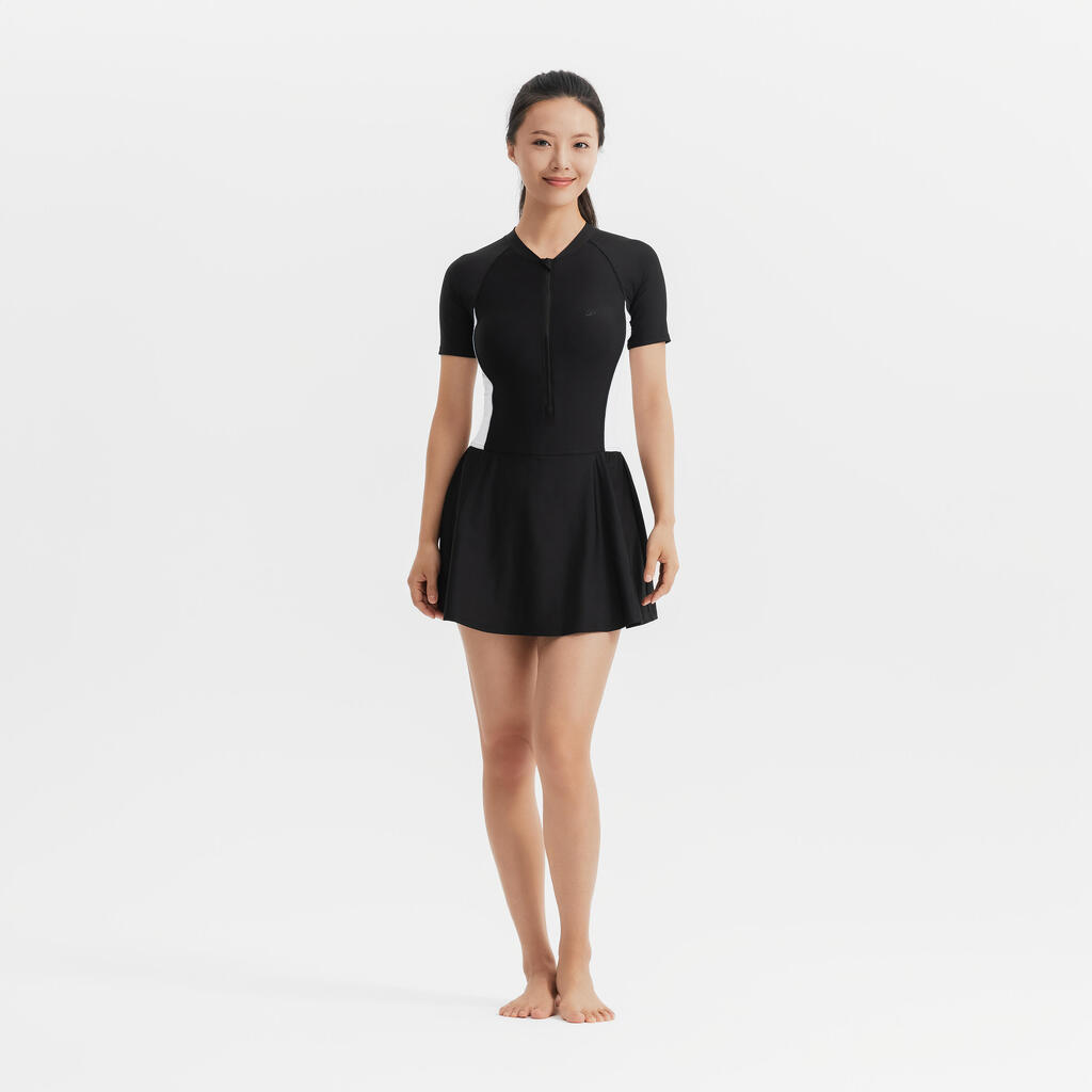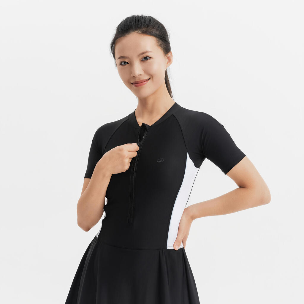 مايوه سباحة قطعة واحدة بجيبة مزودة بسوستة للسيدات - أسود/أبيض