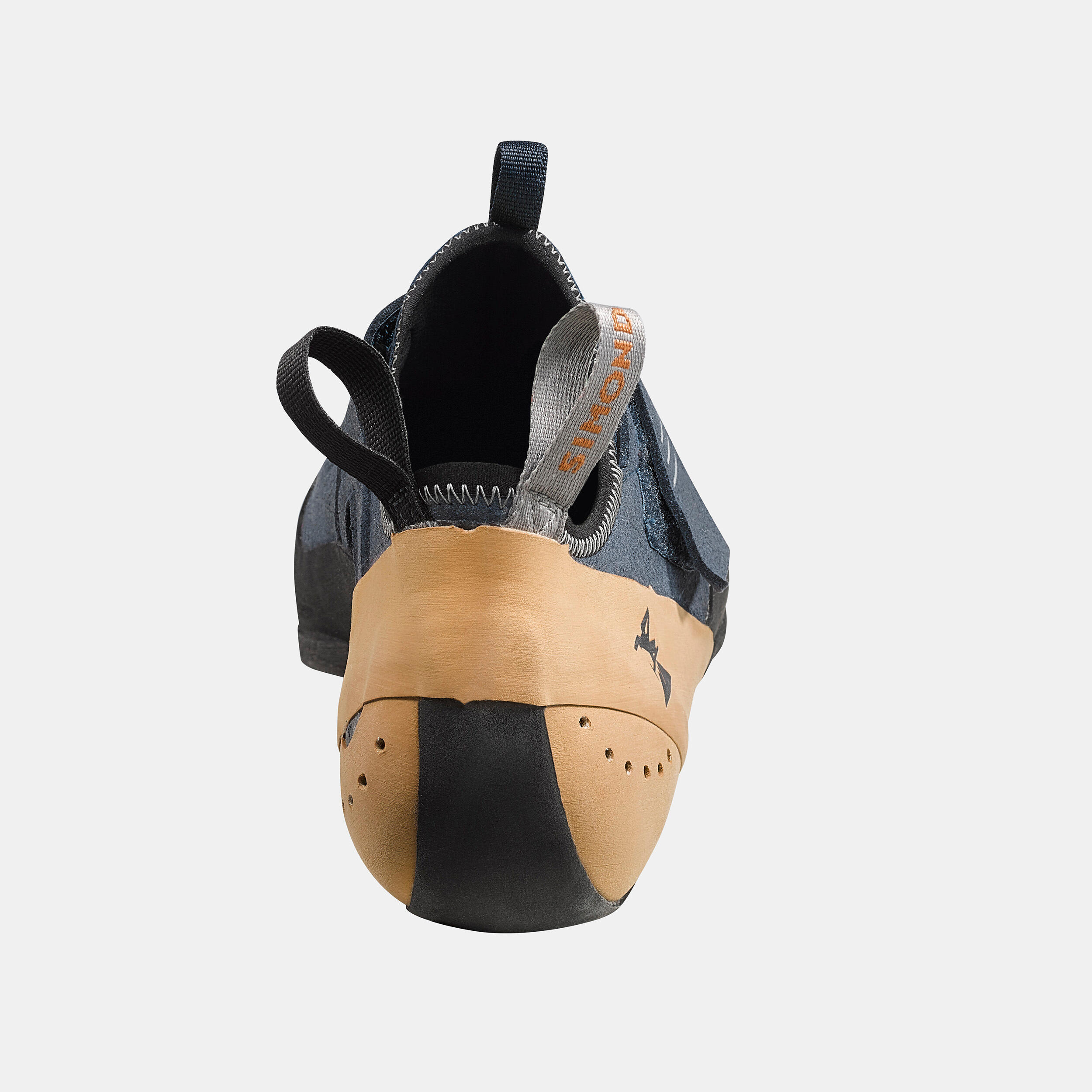 Arch shape, asymmetrical and significant tension in the heel (moderate level). This shape provides a high level of precision and power during your movements and optimises contact on small holds.