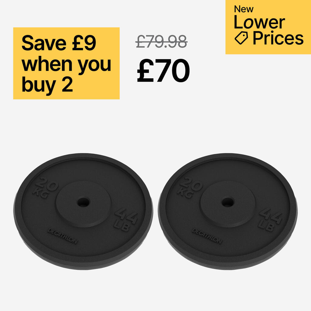 Don't forget to invest in a pair of disc collars to prevent your weights from slipping on the bar as you work out. Ours are sold as a pair (ref: 8574652).